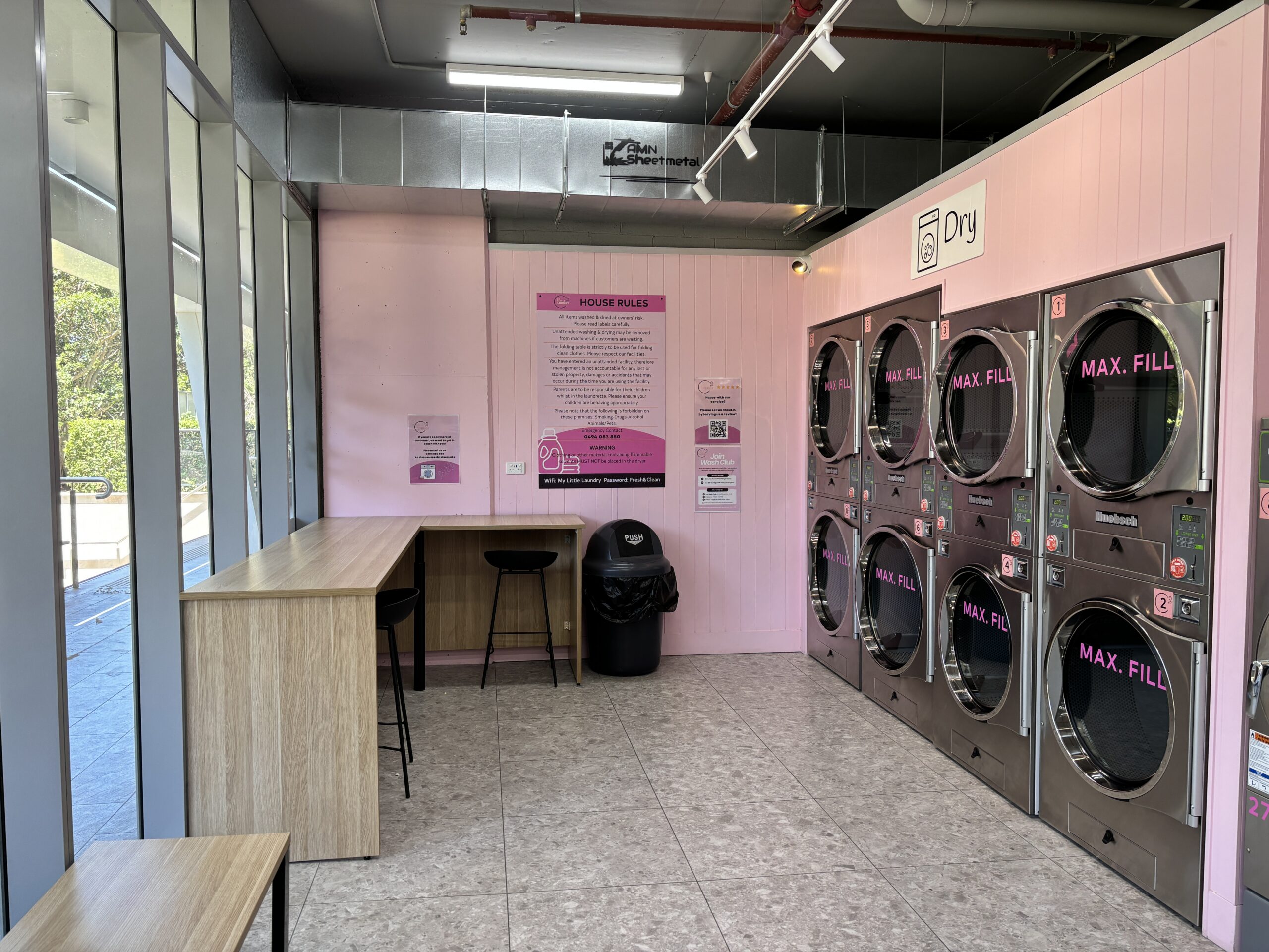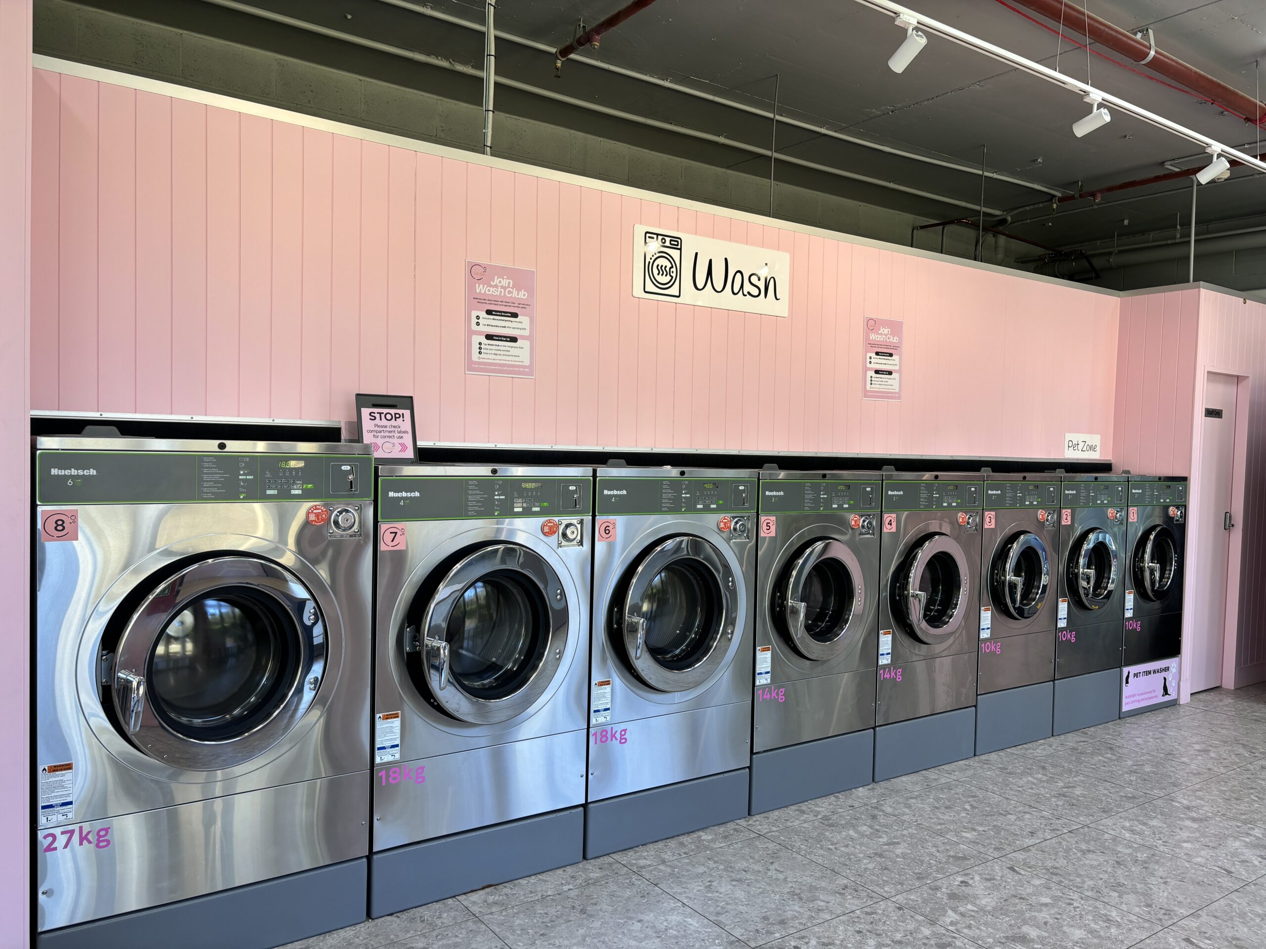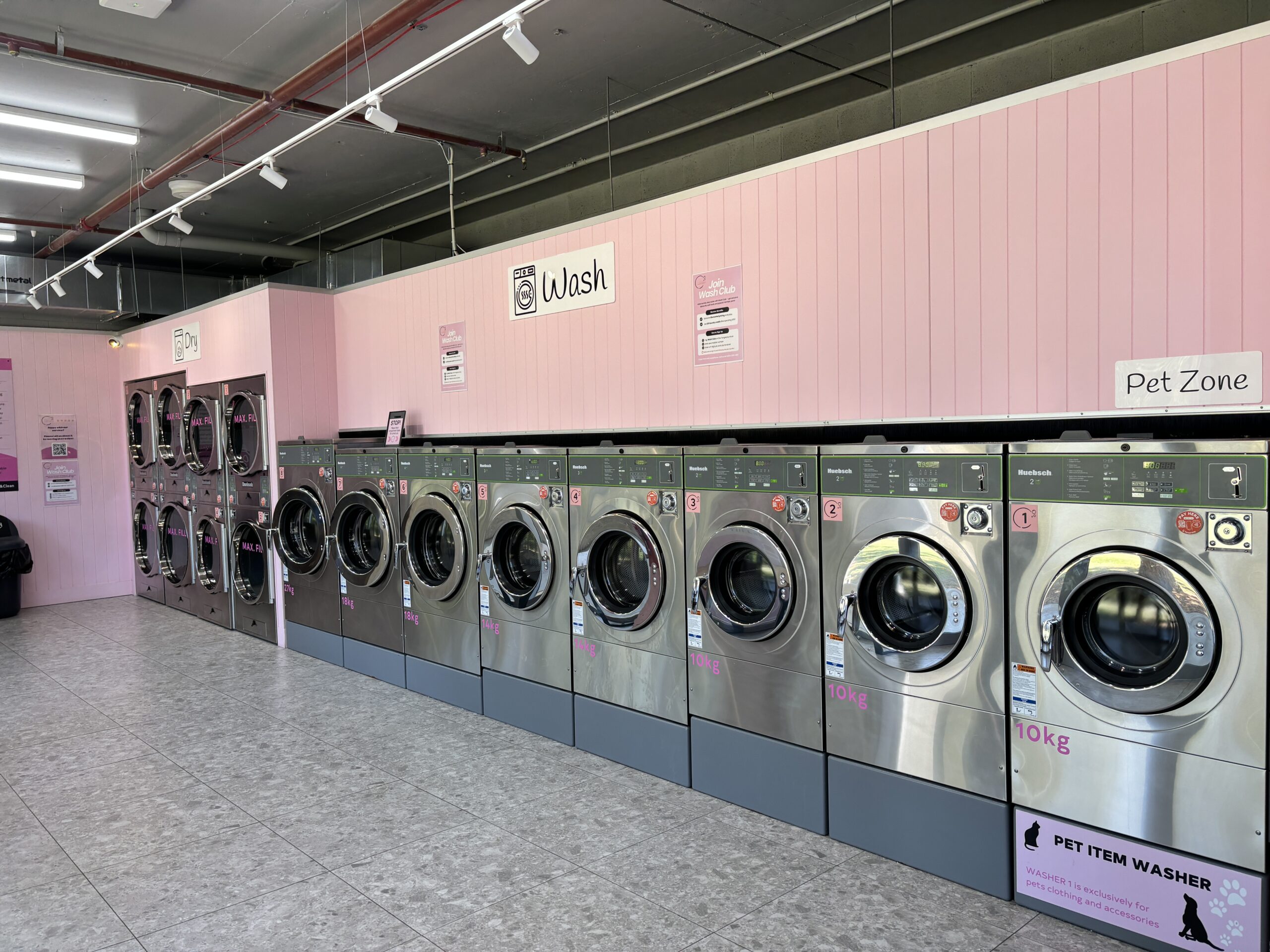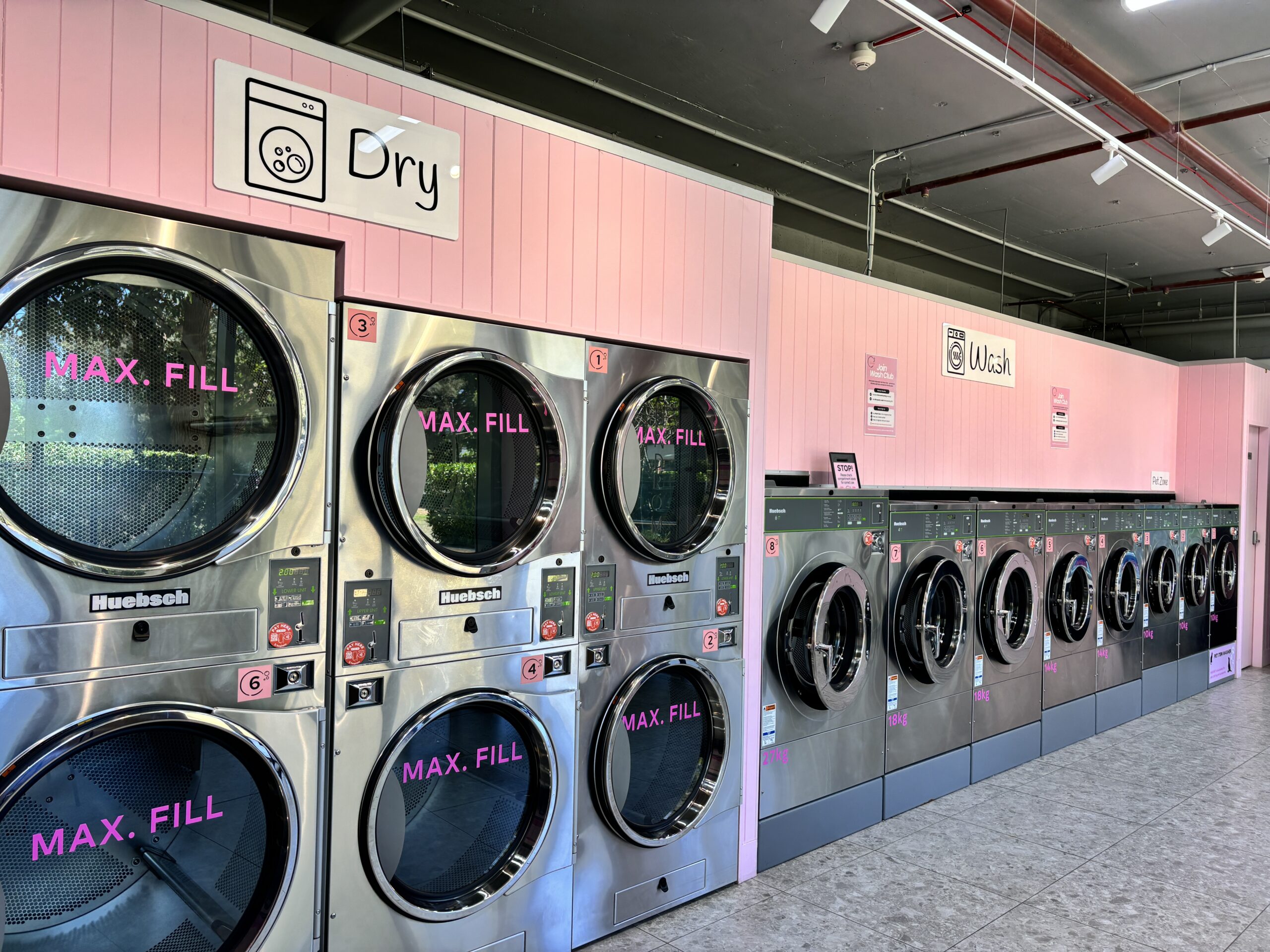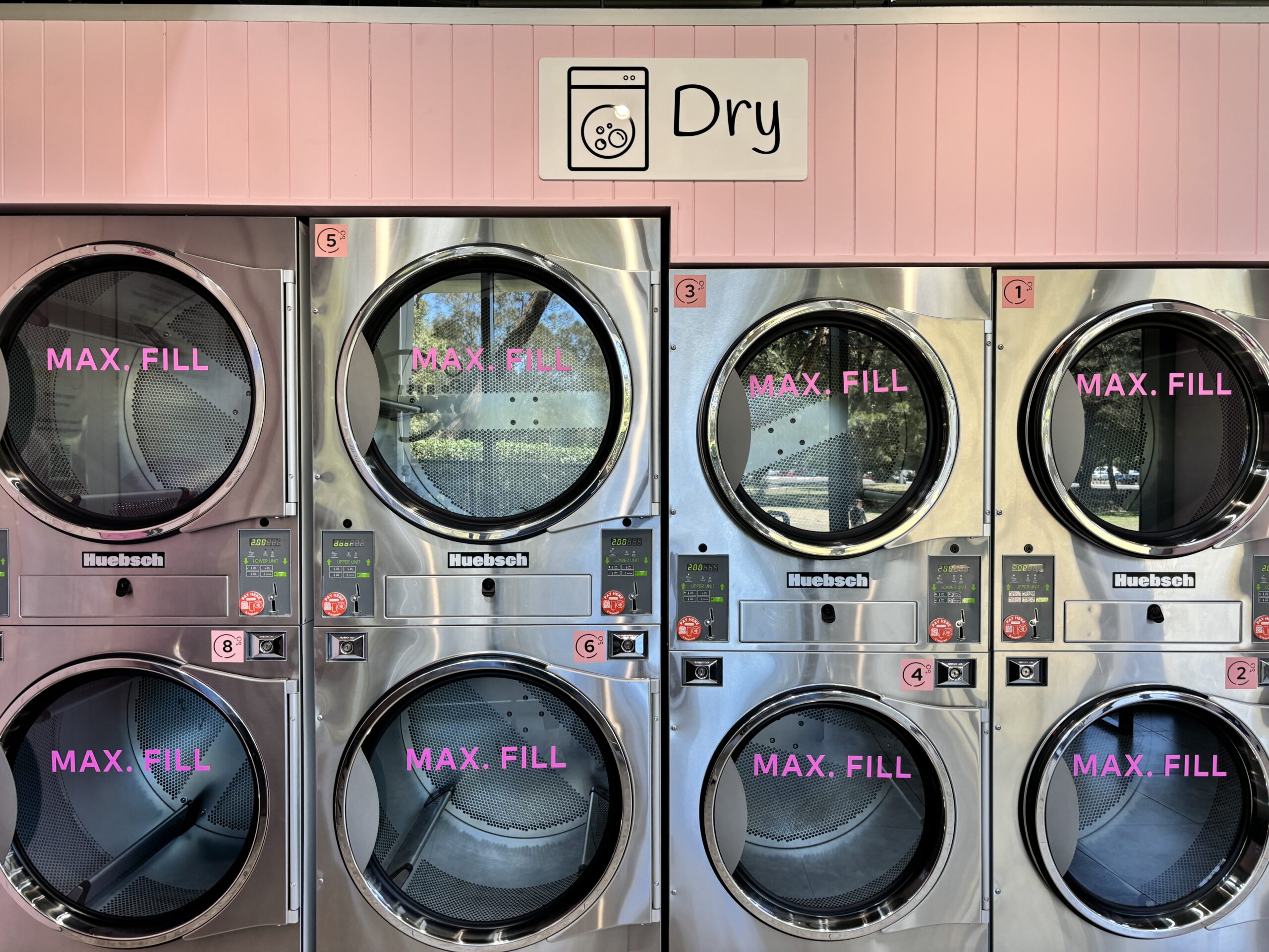 The space is clean, bright, and easy to use, featuring 8 Huebsch industrial washing machines that can handle everything from everyday loads to bulkier items like bedding and towels. Alongside this, 8 Huebsch industrial dryers ensure fast and efficient drying, so you can get everything done in one visit.